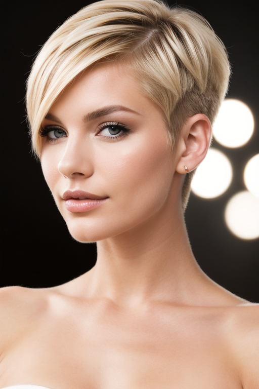 A woman with blonde hair styled in a pixie cut with a side-swept bang looks at the camera with a subtle smile.