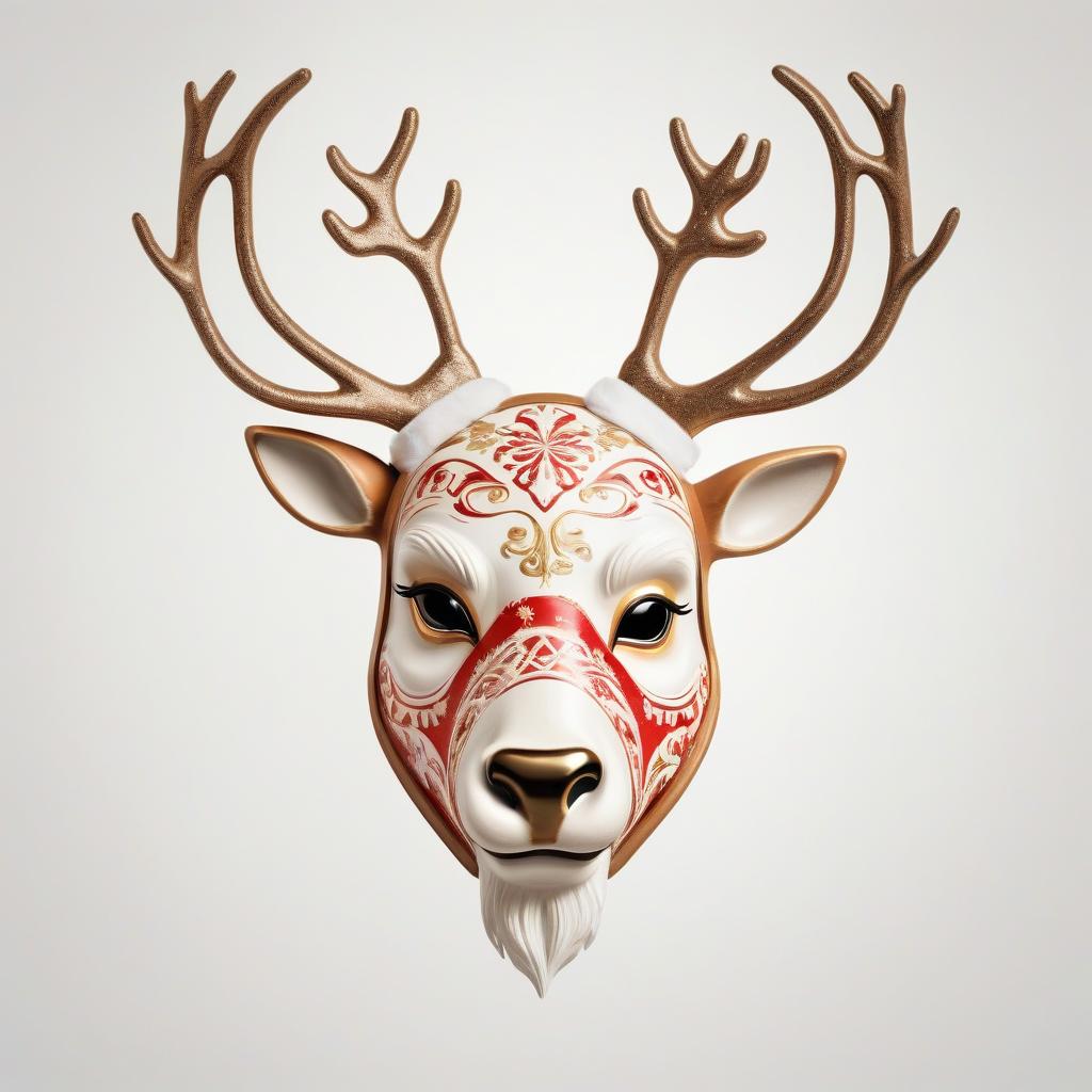 A white reindeer mask with ornate red and gold designs. The mask has large, dark eyes and a long, white beard. The antlers are brown and curved.
