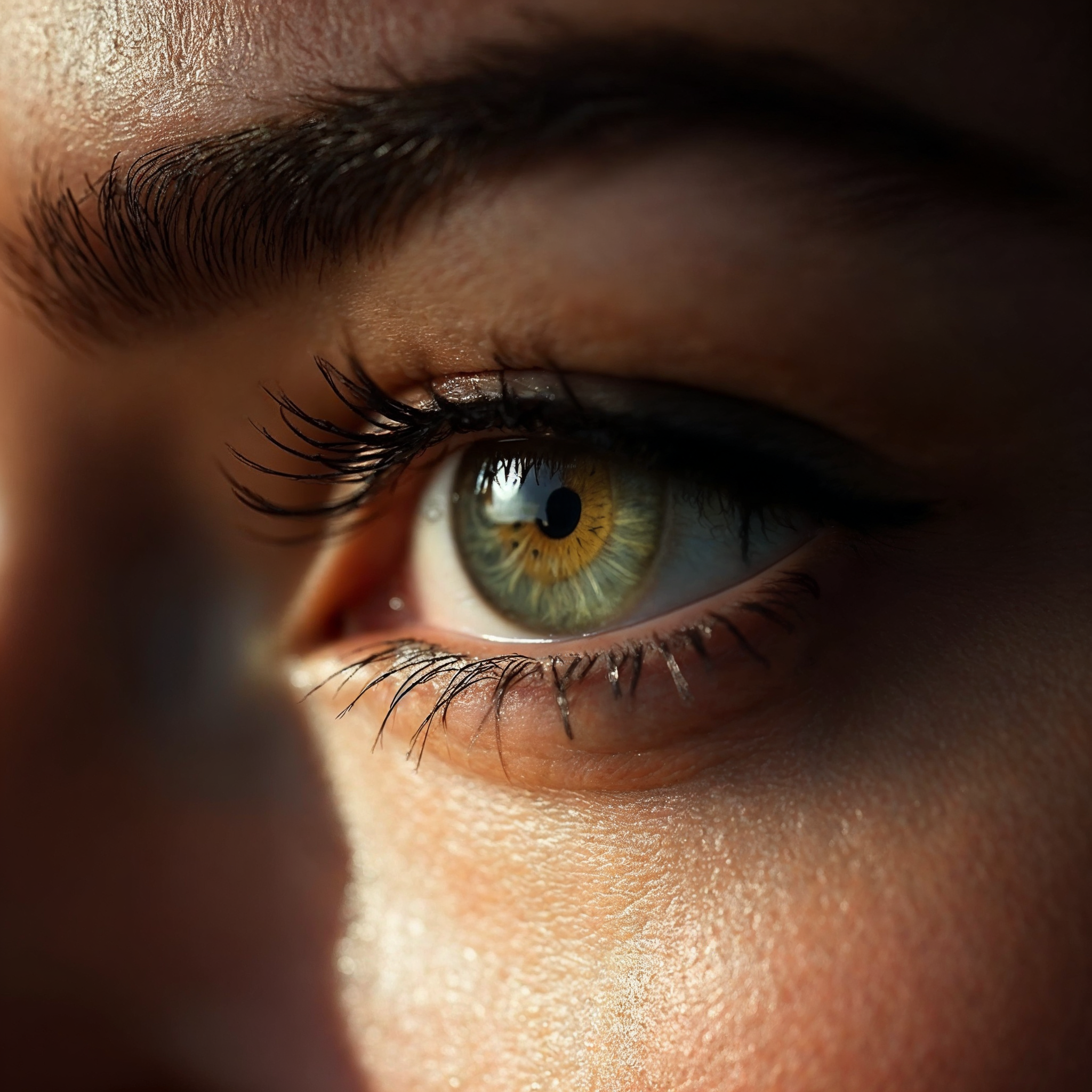 A close-up view of a woman's eye with long eyelashes. Light casts a shadow on the left side of the face.