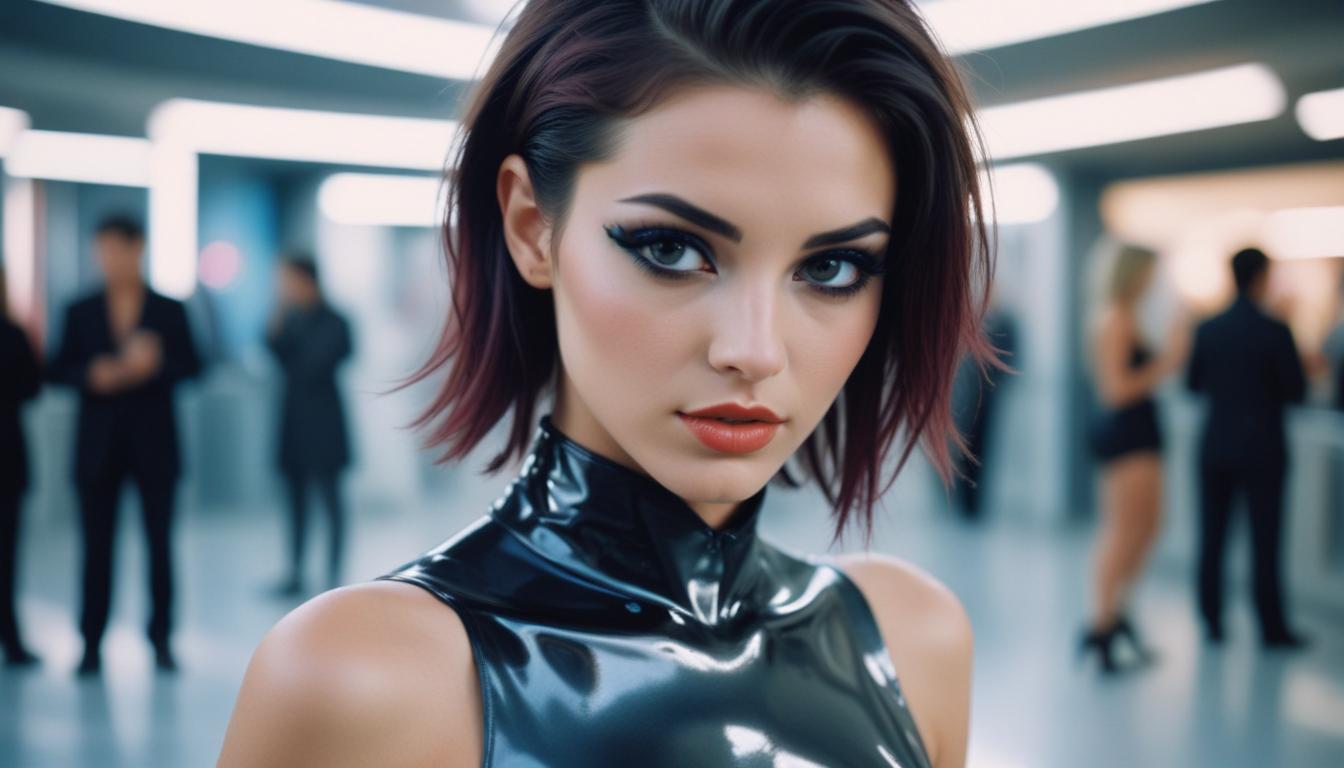 A woman with short, dark hair and heavy eye makeup stares at the camera in a modern building, surrounded by other people.