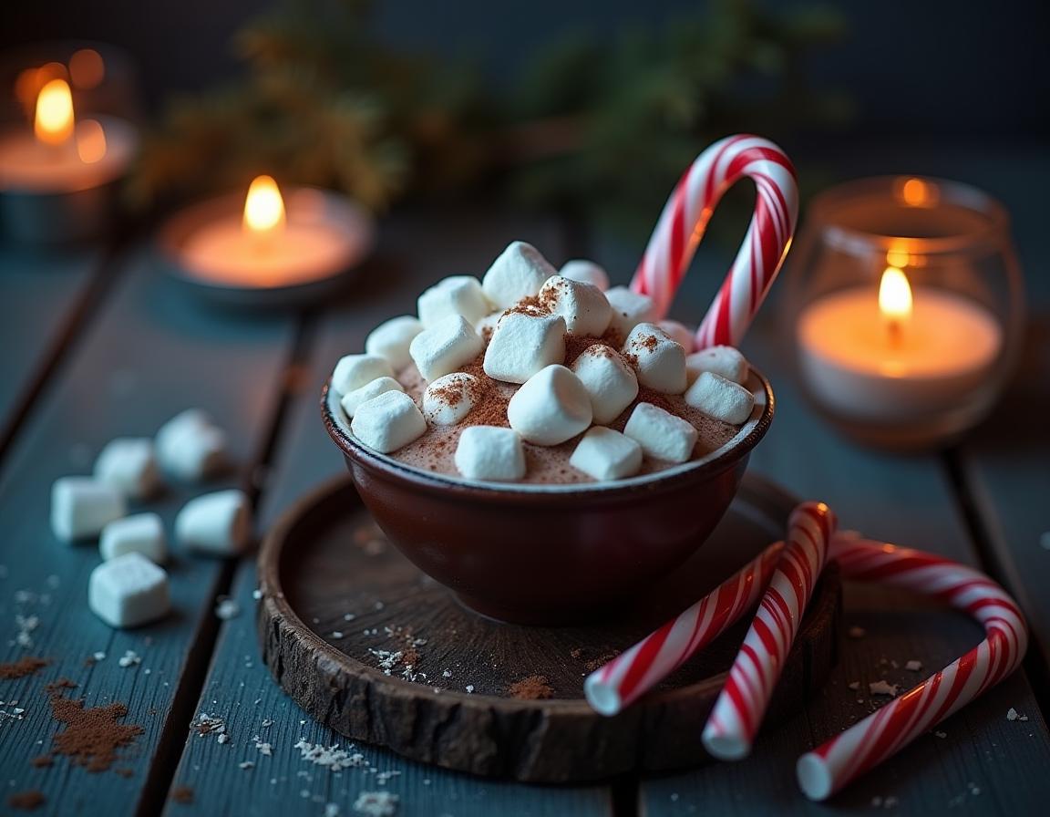 A bowl of hot chocolate topped with marshmallows and a candy cane sits on a wooden table next to a candle and other candy canes.