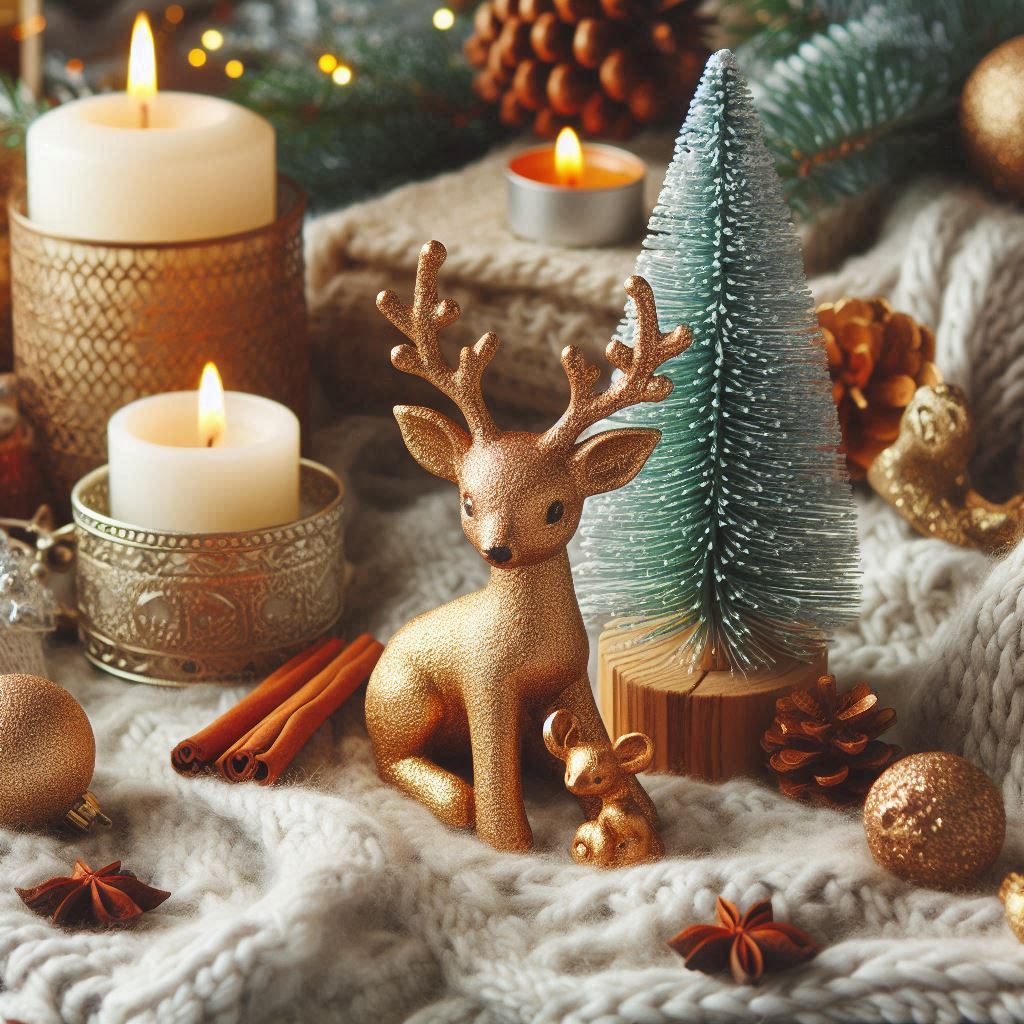 blanket, candle, christmas, cinnamon sticks, cozy, decor, decoration, festive, figurine, gold, holiday, home, knitted, pine tree, pinecone, reindeer, season, warm, white, winter