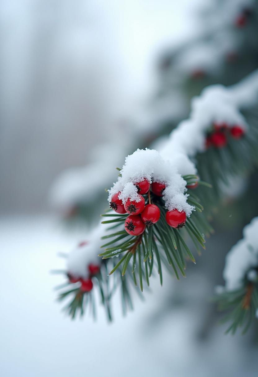 A close-up of a snow-covered evergreen branch with a cluster of bright red berries.