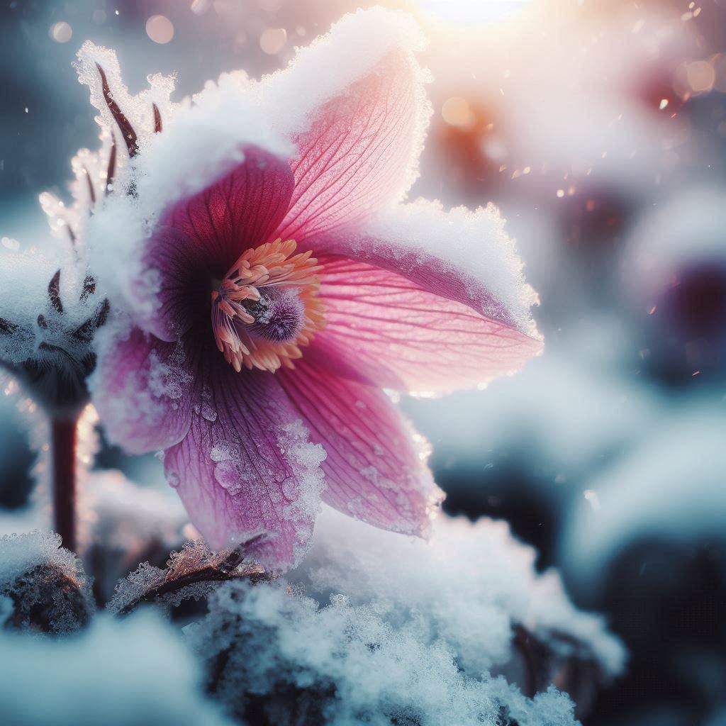 beautiful, bloom, blossom, close-up, cold, delicate, flower, frozen, garden, macro, nature, outdoors, petals, pink, plant, season, snow, stem, white, winter