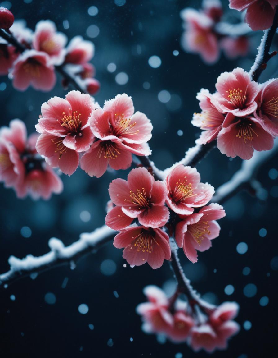 background, beauty, bloom, blossom, branch, closeup, cold, delicate, floral, flowers, frosty, macro, nature, petals, pink, snow, snowing, soft, tree, winter