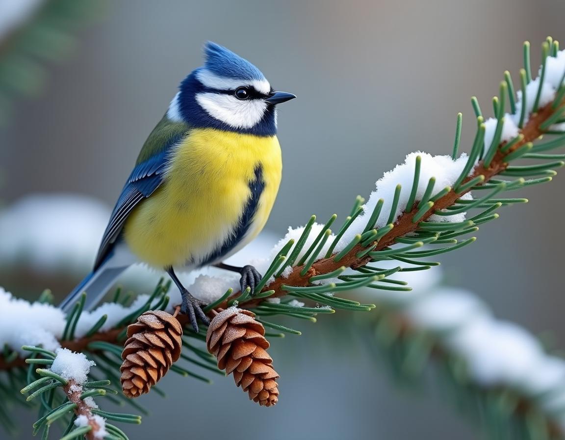 bird, blue, blue tit, branch, cone, forest, nature, perched, perching, pine, pine cone, plumage, small bird, snow, snowy, tree, wildlife, winter, woodland, yellow
