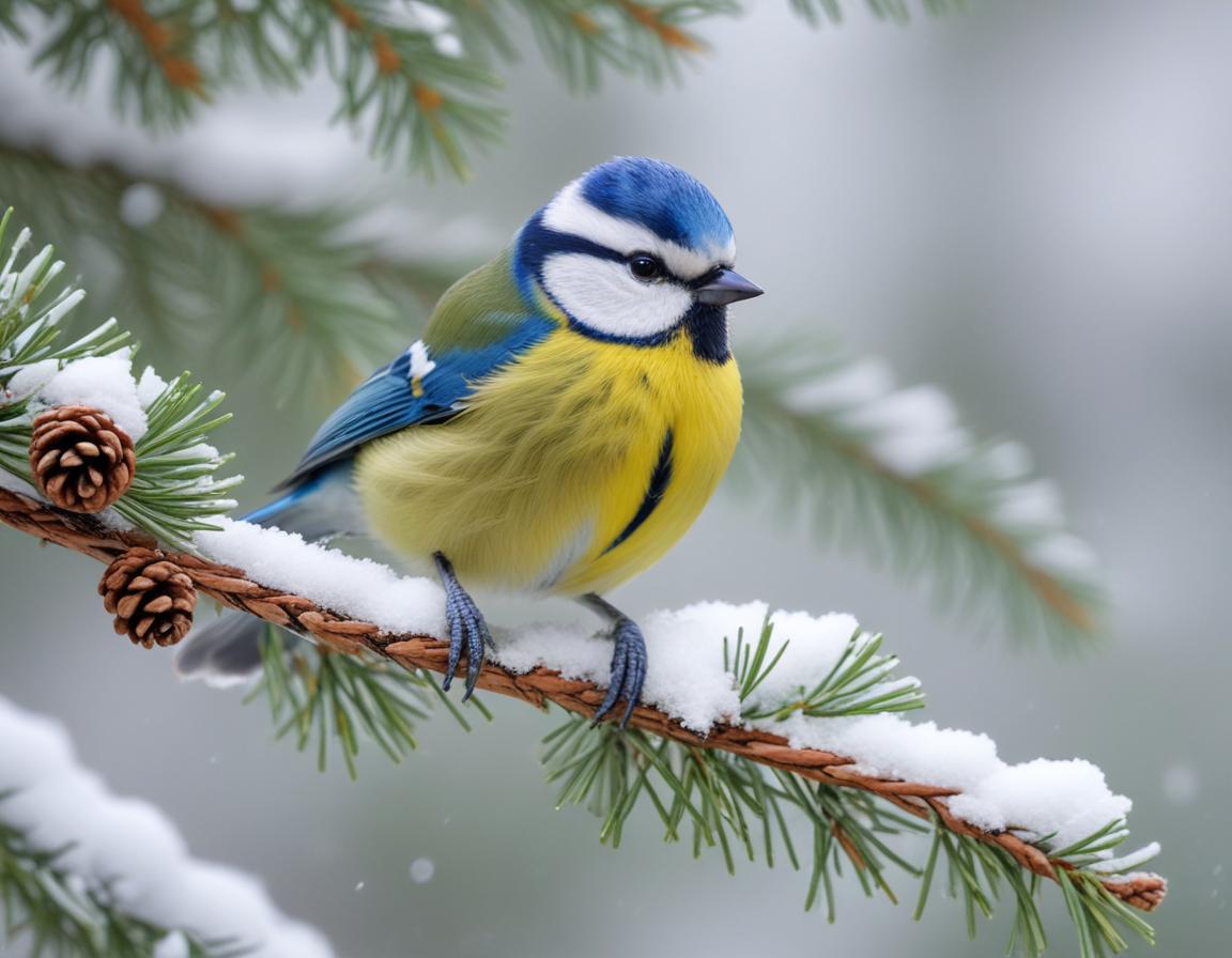 avian, beak, bird, blue tit, branch, cold, feather, forest, frost, nature, outdoor, perching, pine, snow, snow-covered, tail, tree, wildlife, winter, woodland