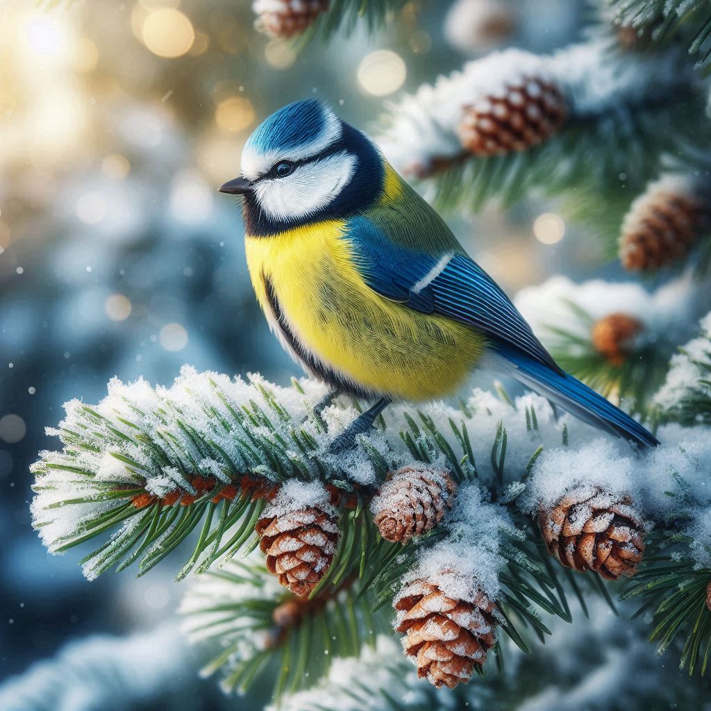 A blue tit sits on a snow-covered pine branch with pine cones.