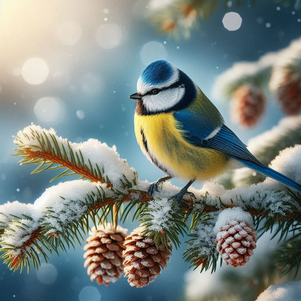 avian, bird, blue, blue tit, branch, cold, fluffy, forest, nature, perched, perching, pine, pine cone, plumage, small, snow, tree, wildlife, winter, yellow