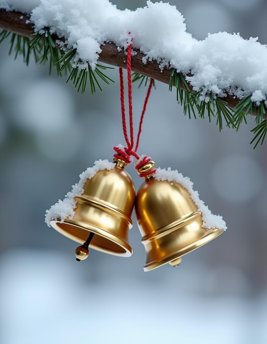 Golden bells hang from a snowy branch