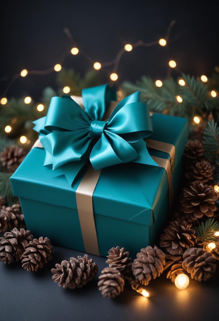 A teal gift box with a large satin bow is placed on a dark surface. The gift box is surrounded by brown pine cones and string lights.