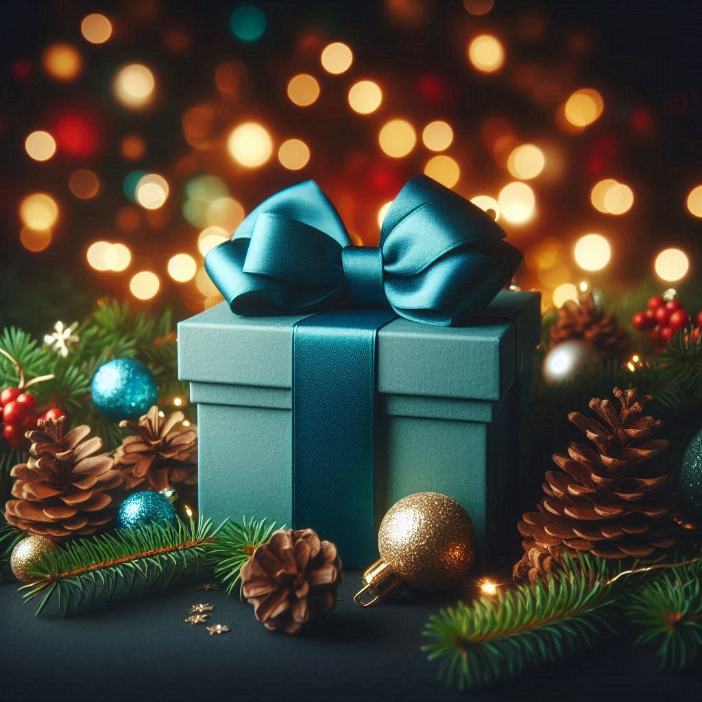 A teal gift box with a large blue bow is sitting on a dark surface. The box is surrounded by pine branches, pinecones, and Christmas ornaments.