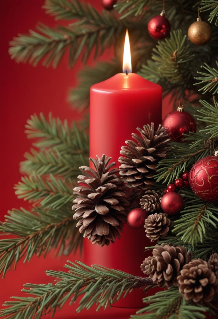 A lit red candle stands surrounded by pine branches decorated with pine cones and red ornaments.