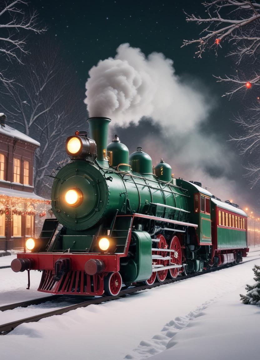 building, christmas, green, holiday, lights, locomotive, night, old, railroad, retro, snow, stars, steam engine, town, tracks, train, transportation, travel, vintage, winter
