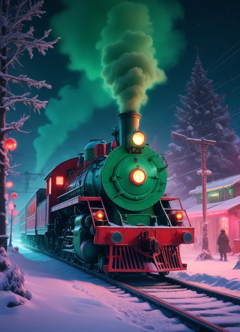 building, christmas, christmas lights, decoration, green, holiday, lights, locomotive, night, red, smoke, snow, snow covered, steam train, town, tracks, train tracks, travel, winter, winter scene