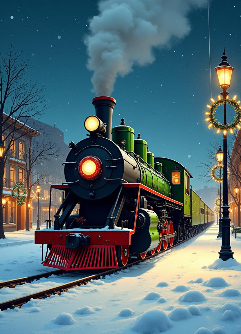 building, christmas, city, festive, holiday, journey, lamp post, lights, locomotive, night, railroad, snow, steam engine, street, town, tracks, train, transportation, travel, winter