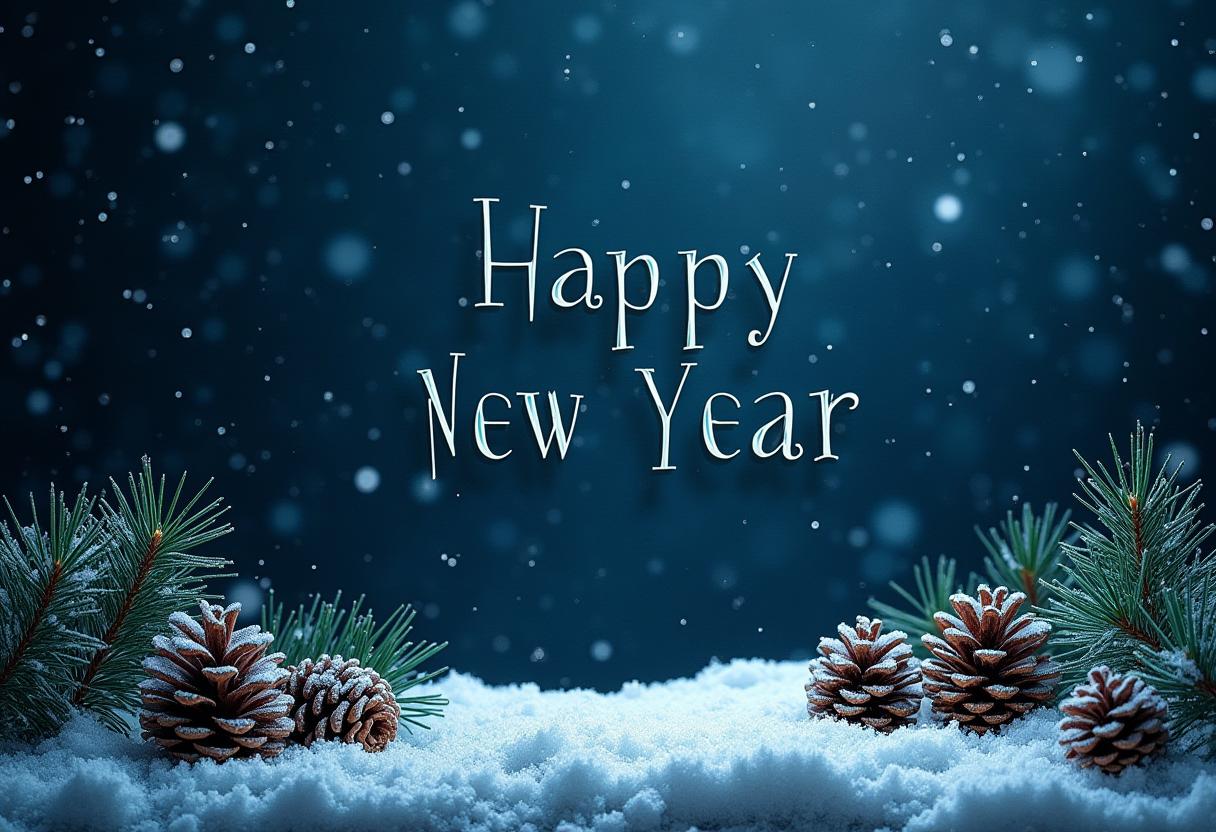 Pine cones lay in the snow with a dark blue background and the words Happy New Year in white.