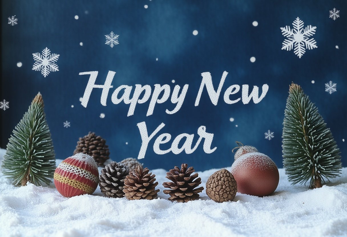 A snowy scene with two small pine trees, pine cones, and a festive red and white ornament on a bed of fresh snow.