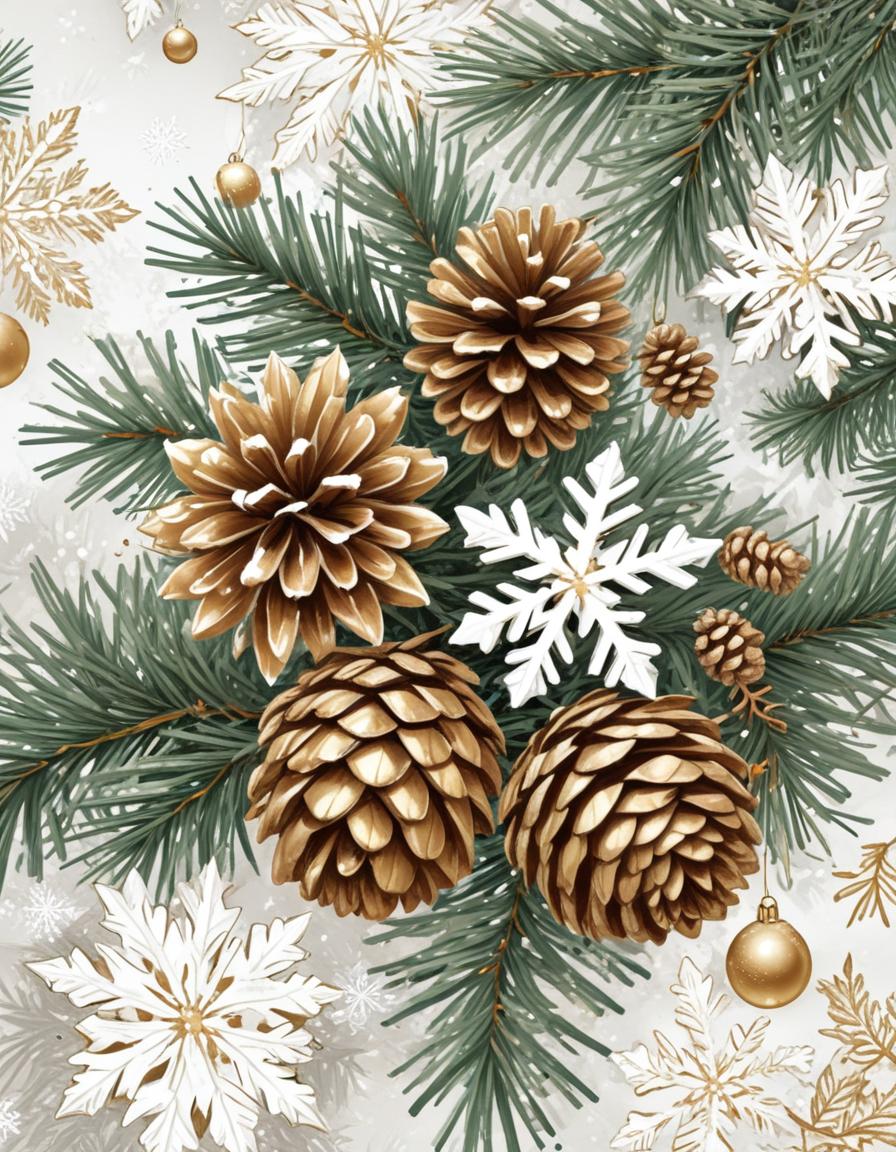 art, background, branch, christmas, decor, decoration, design, festive, gold, graphic, green, holiday, illustration, nature, ornament, pine cones, season, snowflakes, white, winter