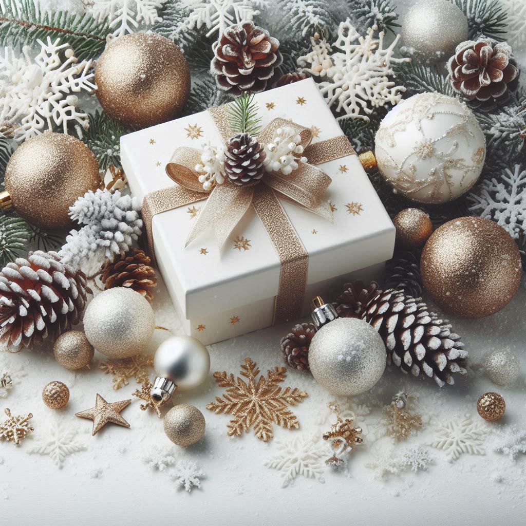 A white gift box with a gold ribbon and pine cone sits among Christmas ornaments on a snowy surface.