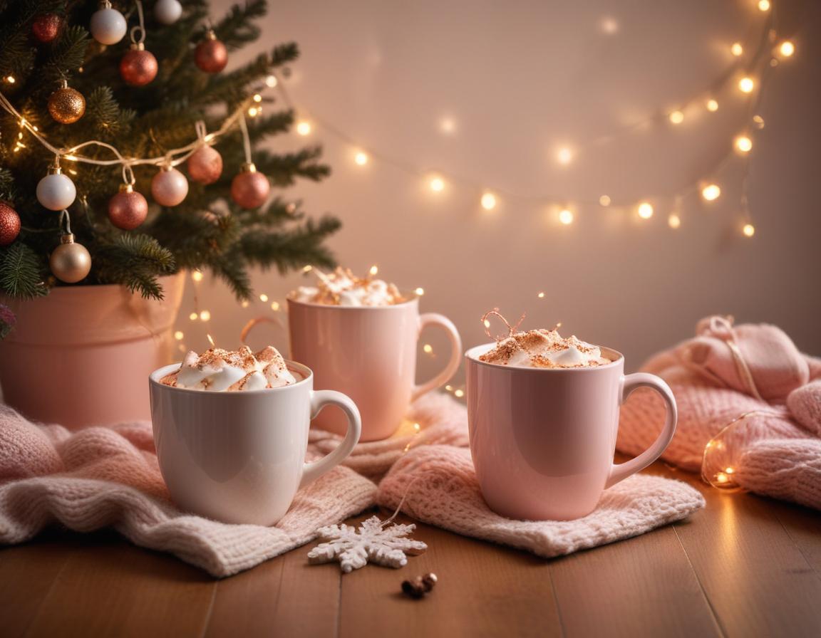 Three mugs of hot cocoa with whipped cream sit by a small Christmas tree, surrounded by a knitted blanket, snowflake, and coffee beans.