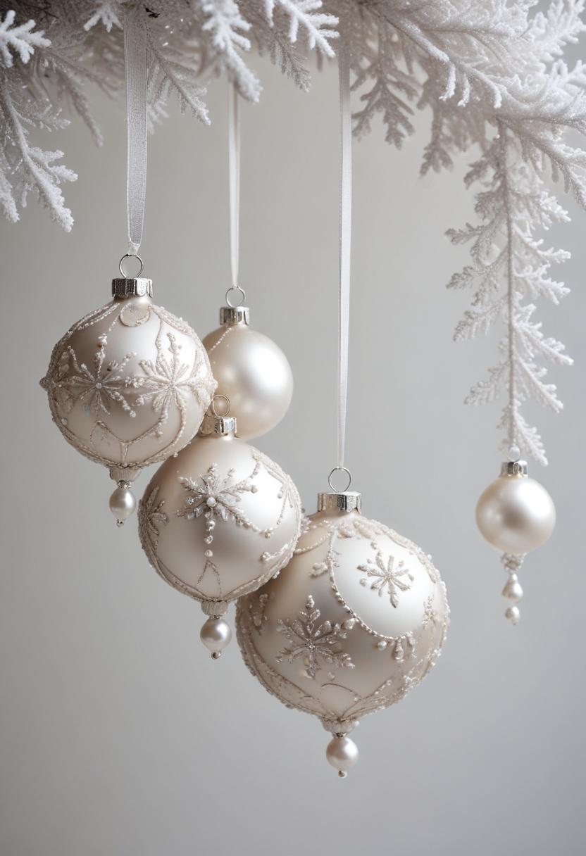 Four white Christmas ornaments with snowflake designs hang from white ribbons against a light grey background.