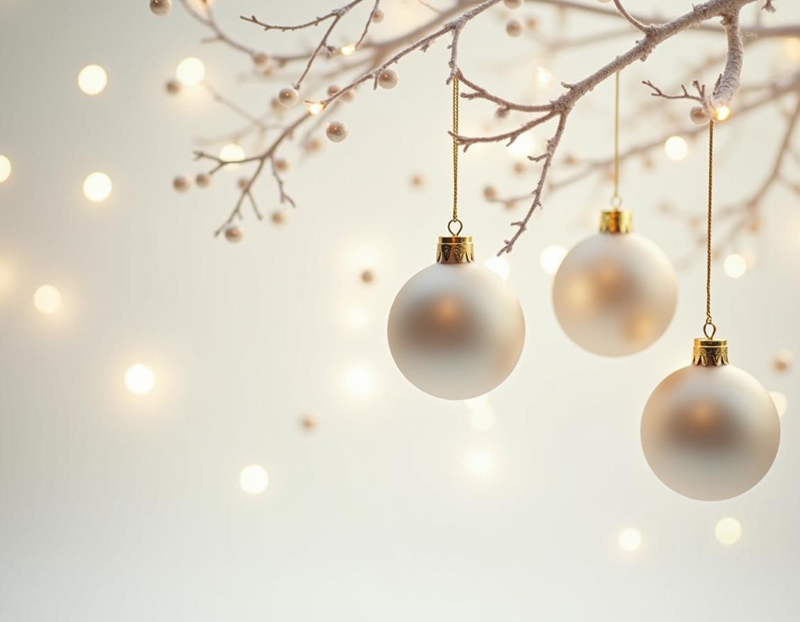 bokeh, branch, celebration, christmas, decor, decoration, elegant, festive, gold, holiday, light, minimal, minimalist, ornament, ornaments, simple, soft, tree, white, winter