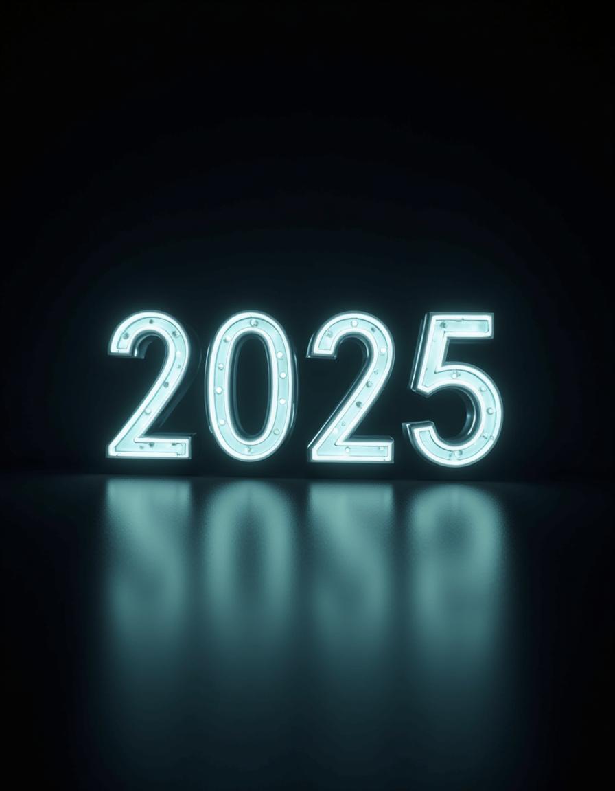 A glowing sign depicting the year 2025 is displayed in front of a dark background. The sign is reflecting on a smooth surface.