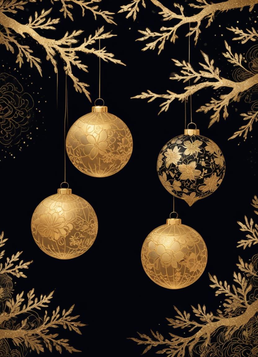 Four Christmas ornaments hang from stylized golden branches on a black background. Three of the ornaments are gold with intricate floral designs.