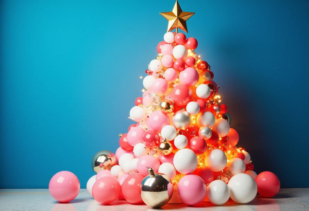 balloon, balloon tree, blue wall, celebration, christmas, christmas decoration, christmas tree, decoration, festive, gold, happy, holiday, holiday decor, lights, ornaments, pink, silver, star, white, winter