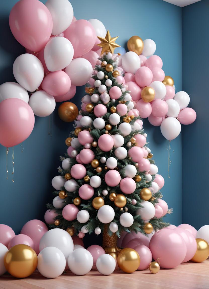 A Christmas tree adorned with pink, white, and gold ornaments stands against a blue wall surrounded by pink, white, and gold balloons.