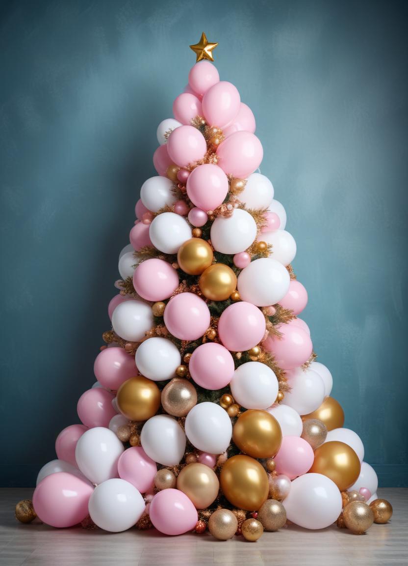 balloon, balloon tree, celebration, christmas, christmas balloon, christmas decor, christmas decorations, decoration, festive, festive decoration, gold, holiday, holiday decor, holiday decorations, ornament, party, pink, star, tree, white