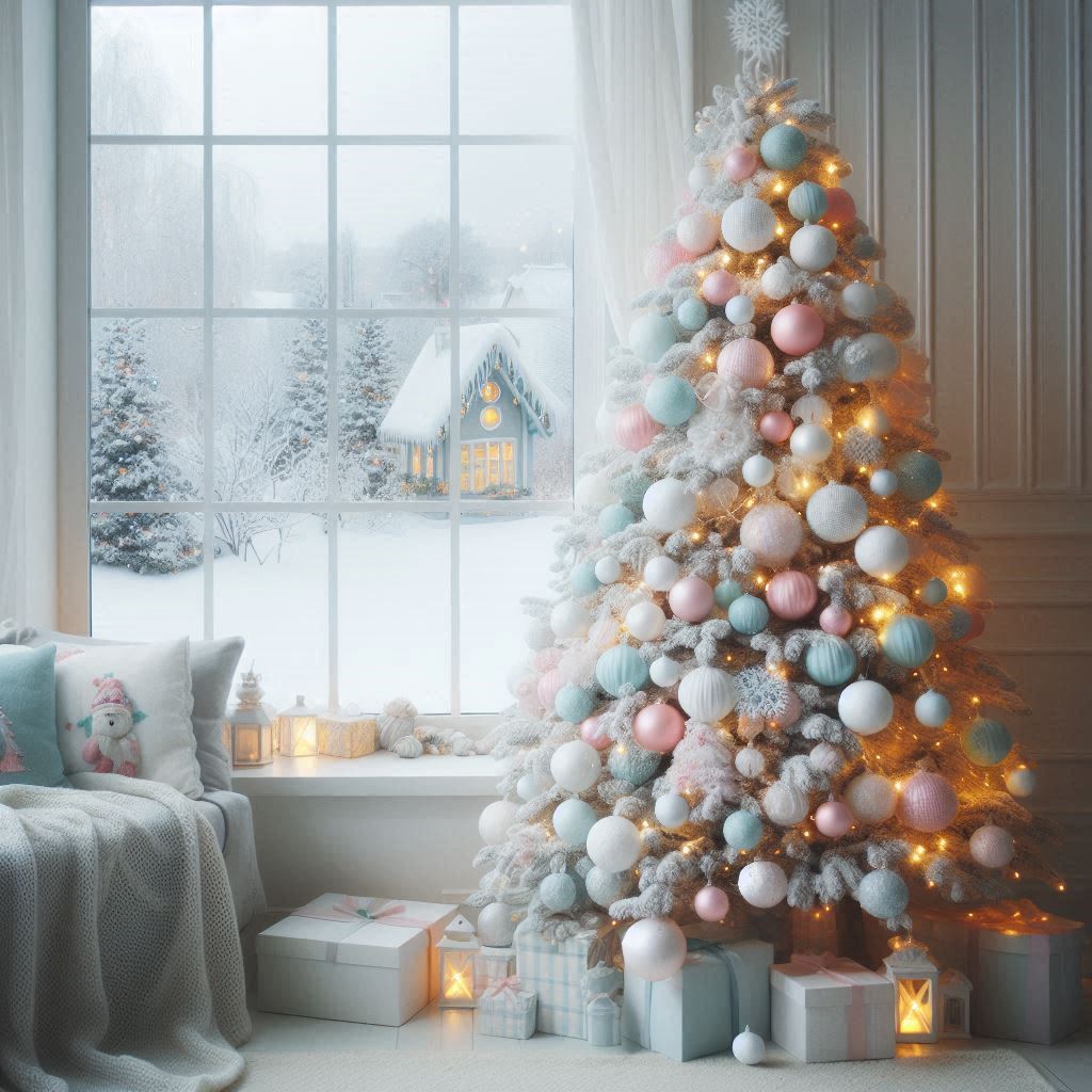 blue, christmas, christmas tree, cozy, decorated, festive, gifts, holidays, house, landscape, lights, ornaments, pink, presents, room, season, snowy, white, window, winter