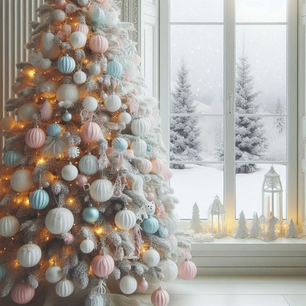 blue, christmas, christmas tree, cozy, december, decoration, falling, festive, holiday, lanterns, lights, ornaments, pink, season, snow, trees, view, white, window, winter