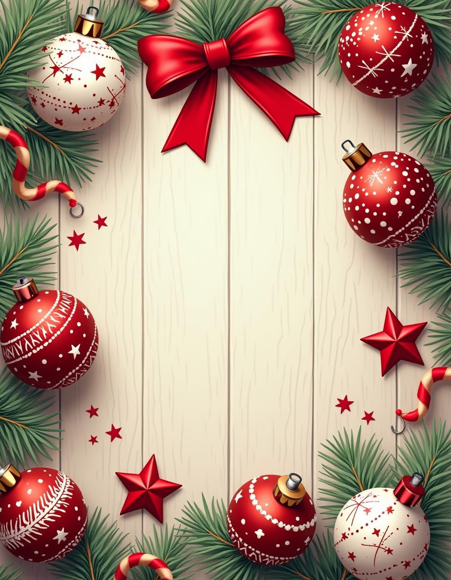 A festive Christmas scene with red and white ornaments, red stars, and evergreen branches on a white wooden background. A large red bow is at the top.