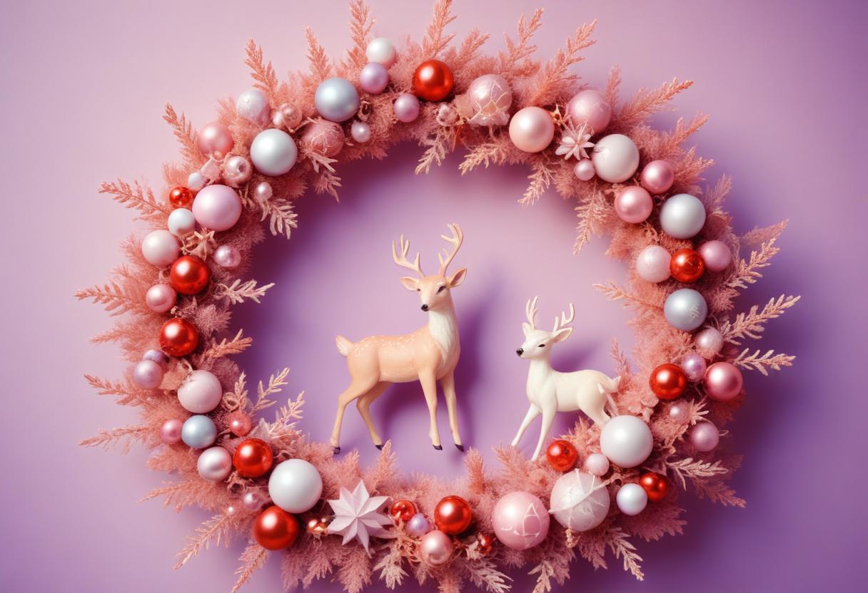 A pink Christmas wreath with red, pink, and white ornaments and two white deer ornaments.