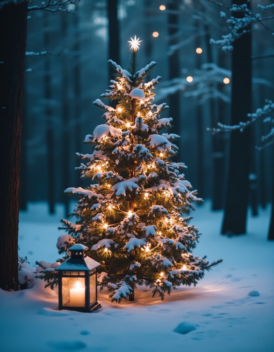 A Christmas tree is adorned with lights and sits in a snowy forest. There is a lantern next to the tree and string lights in the background.