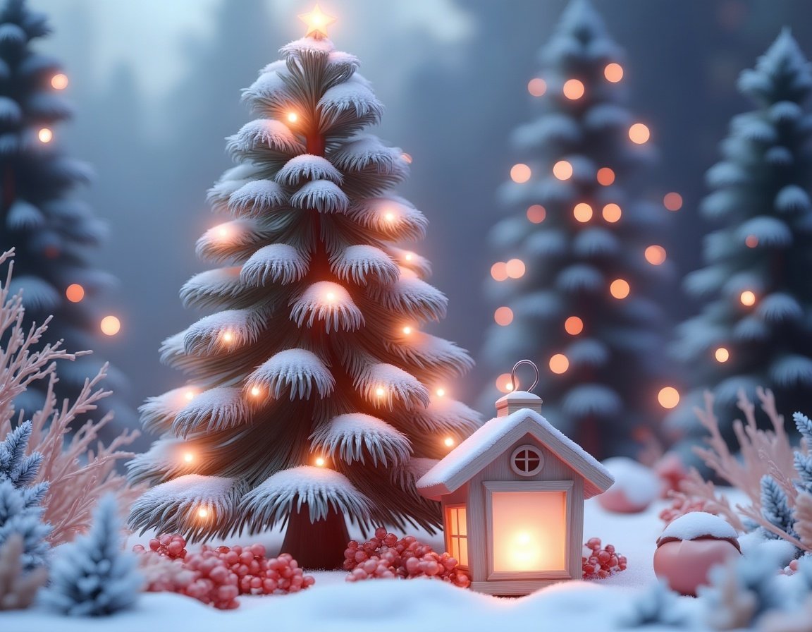 A snow-covered Christmas tree decorated with lights stands in a forest, with a small white lantern glowing beside it.