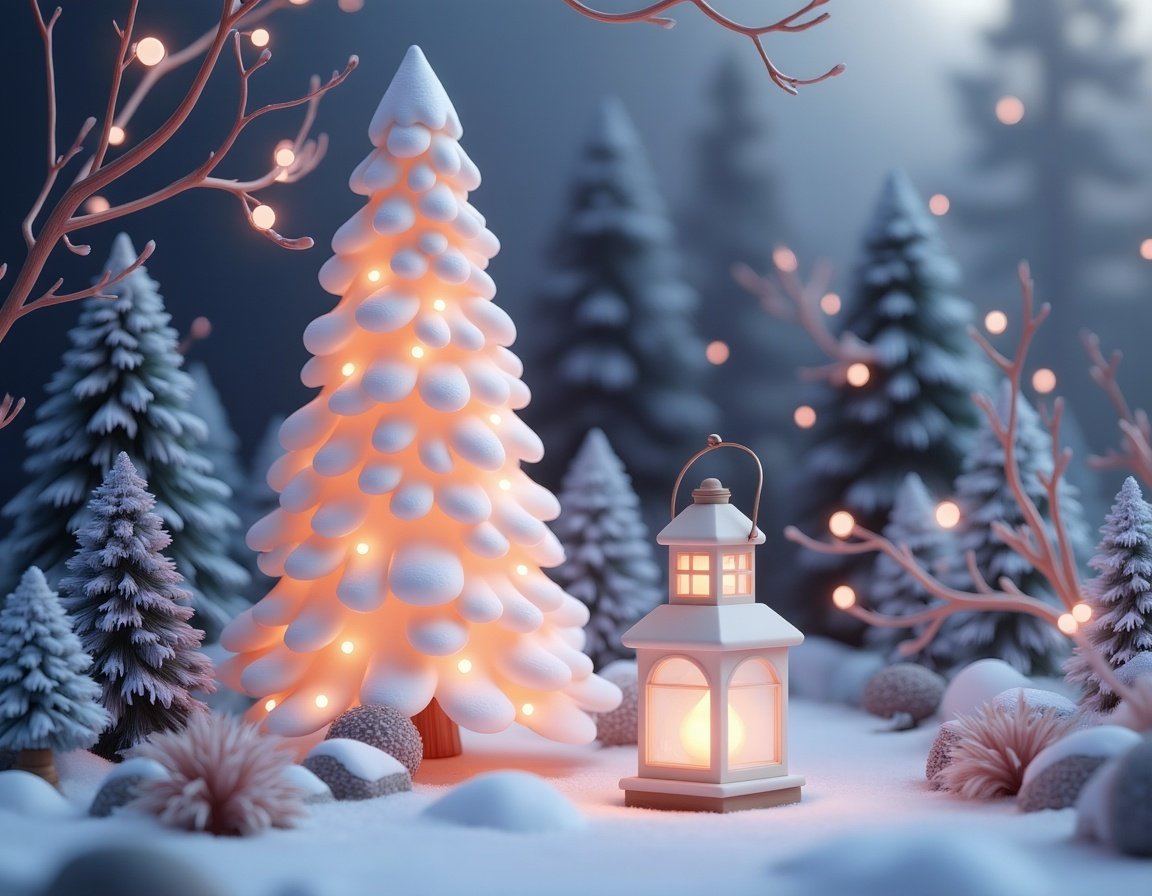 A snowy Christmas tree stands in a winter forest, illuminated by string lights. A white lantern sits beside the tree, casting a warm glow.
