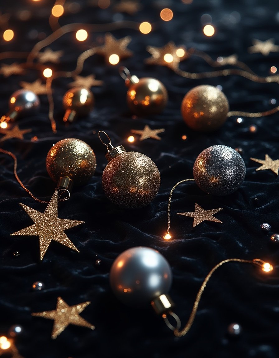 A dark, velvet surface is scattered with gold and silver Christmas ornaments, small stars, and string lights.