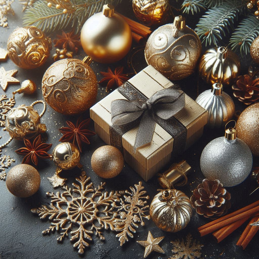 black, christmas, cinnamon, decor, decoration, festive, gift box, glitter, gold, holiday, ornaments, pine, present, ribbon, silver, snowflake, sparkle, star anise, surface, winter