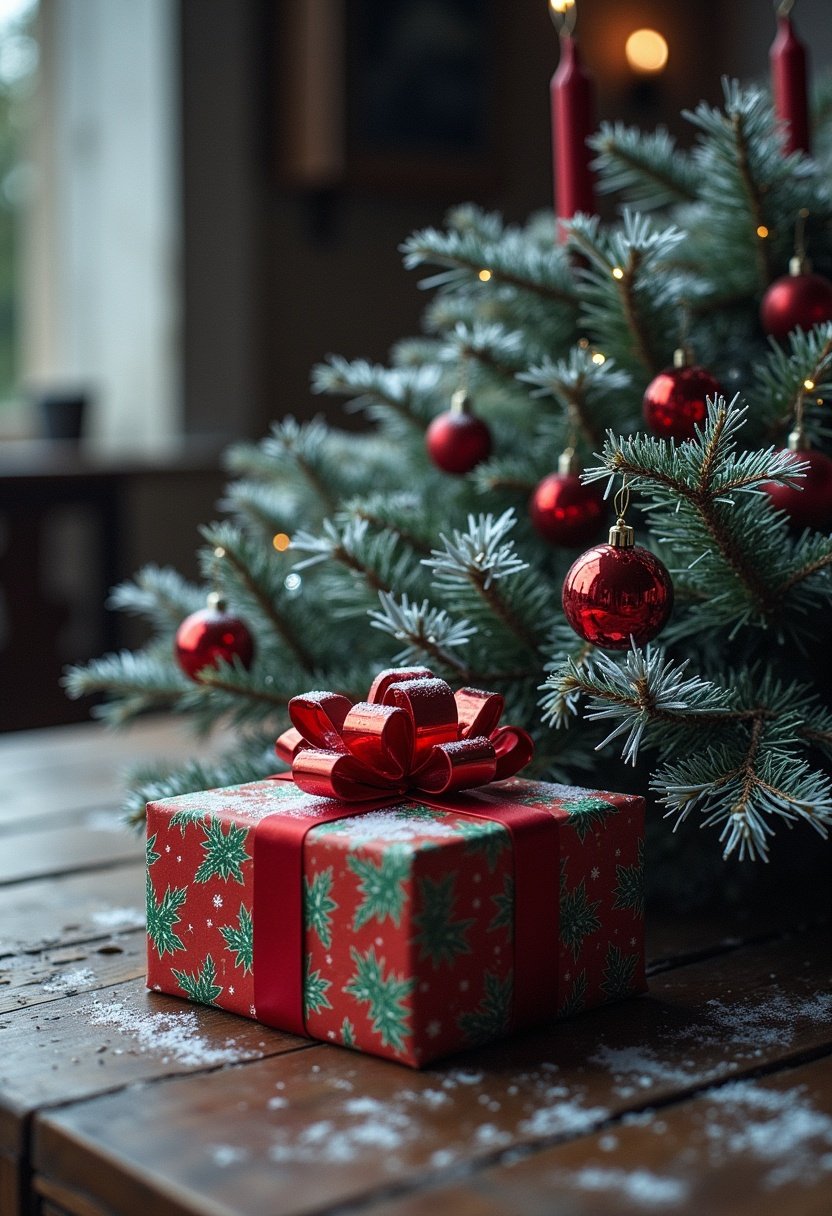 A red gift box with a large red bow and green wrapping paper rests on a wooden table covered in a light dusting of snow.