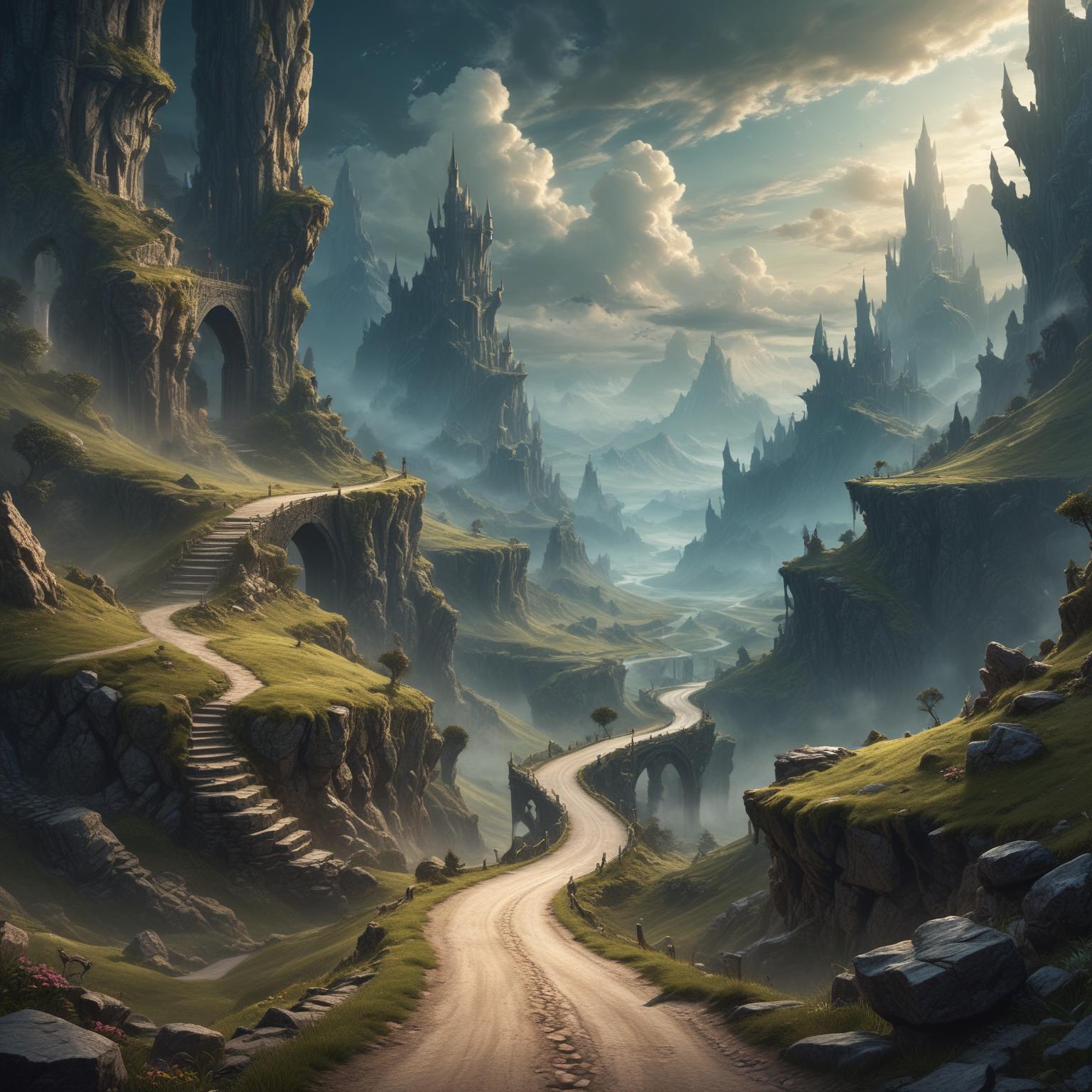 artwork, castle, cliff, cloudy, digital, distant, fantasy, fog, formation, haze, illustration, landscape, mist, mountain, nature, road, rock, sky, valley, winding
