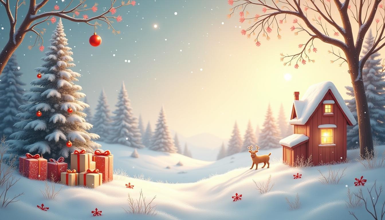 cabin, christmas, christmas tree, cottage, decorations, deer, forest, frozen, gift, holiday, landscape, lights, nature, present, season, snow, snow falling, tree, winter, woods