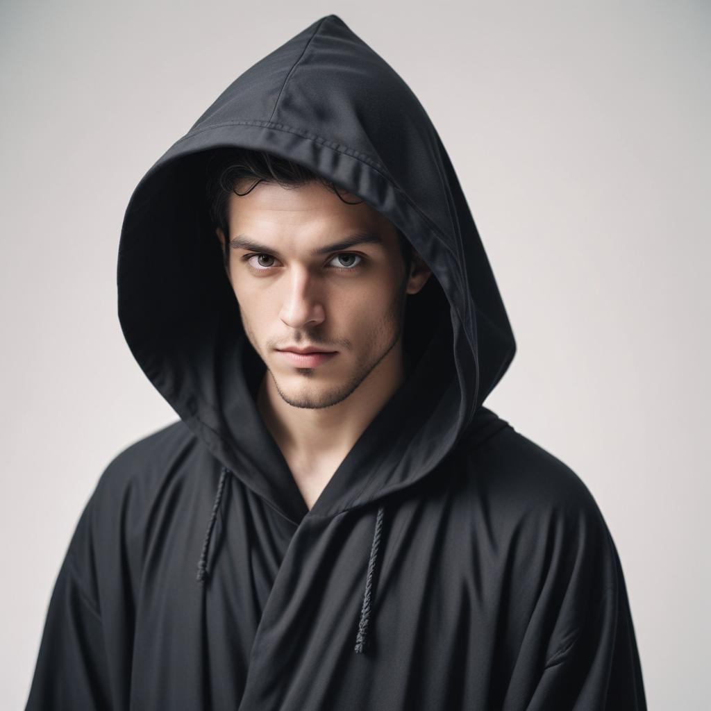 black, clothing, dark, eyes, fashion, garment, hair, hood, intense, look, male, man, model, mysterious, portrait, robe, serious, stare, style, young