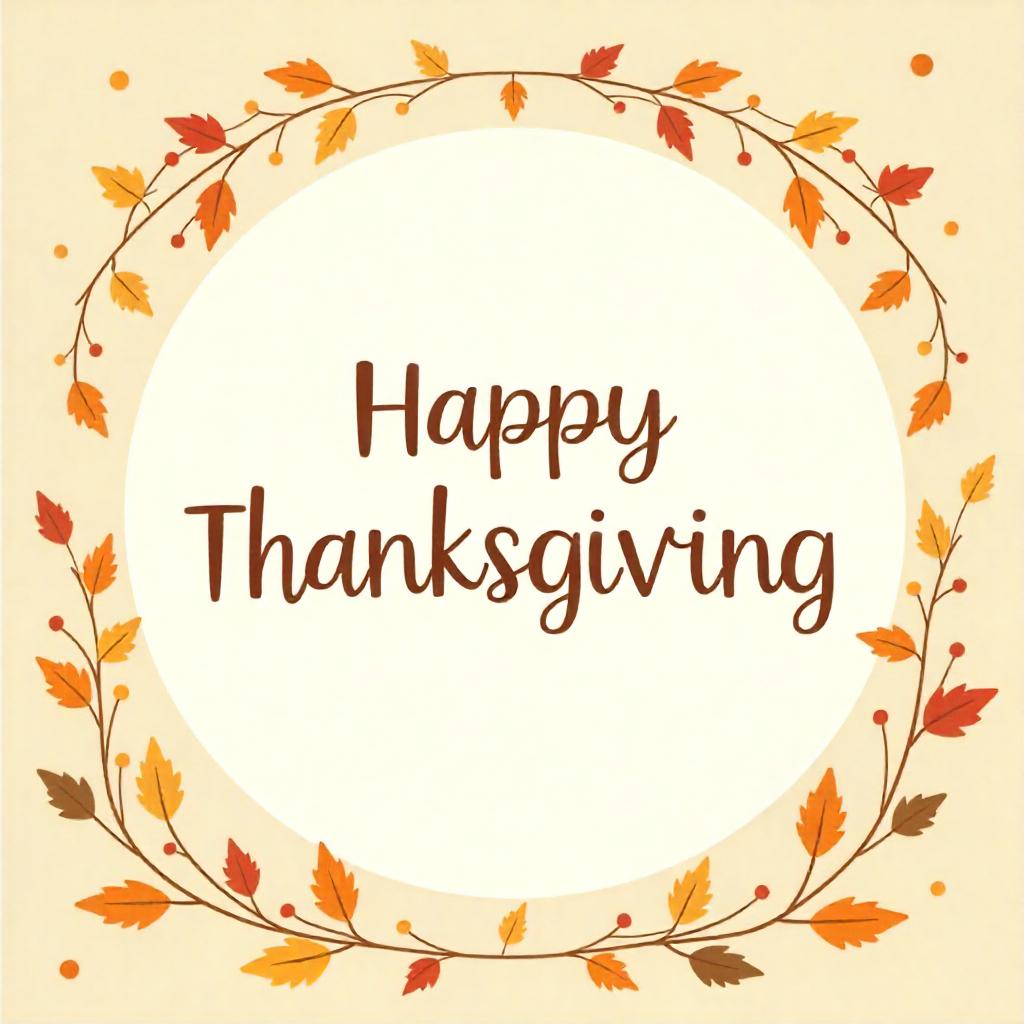 A white circle with Happy Thanksgiving text surrounded by an autumn leaf wreath.