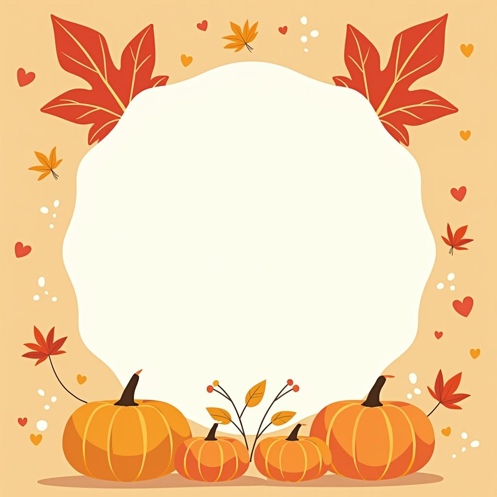 A white circle with an orange background is decorated with pumpkins, leaves, and hearts.