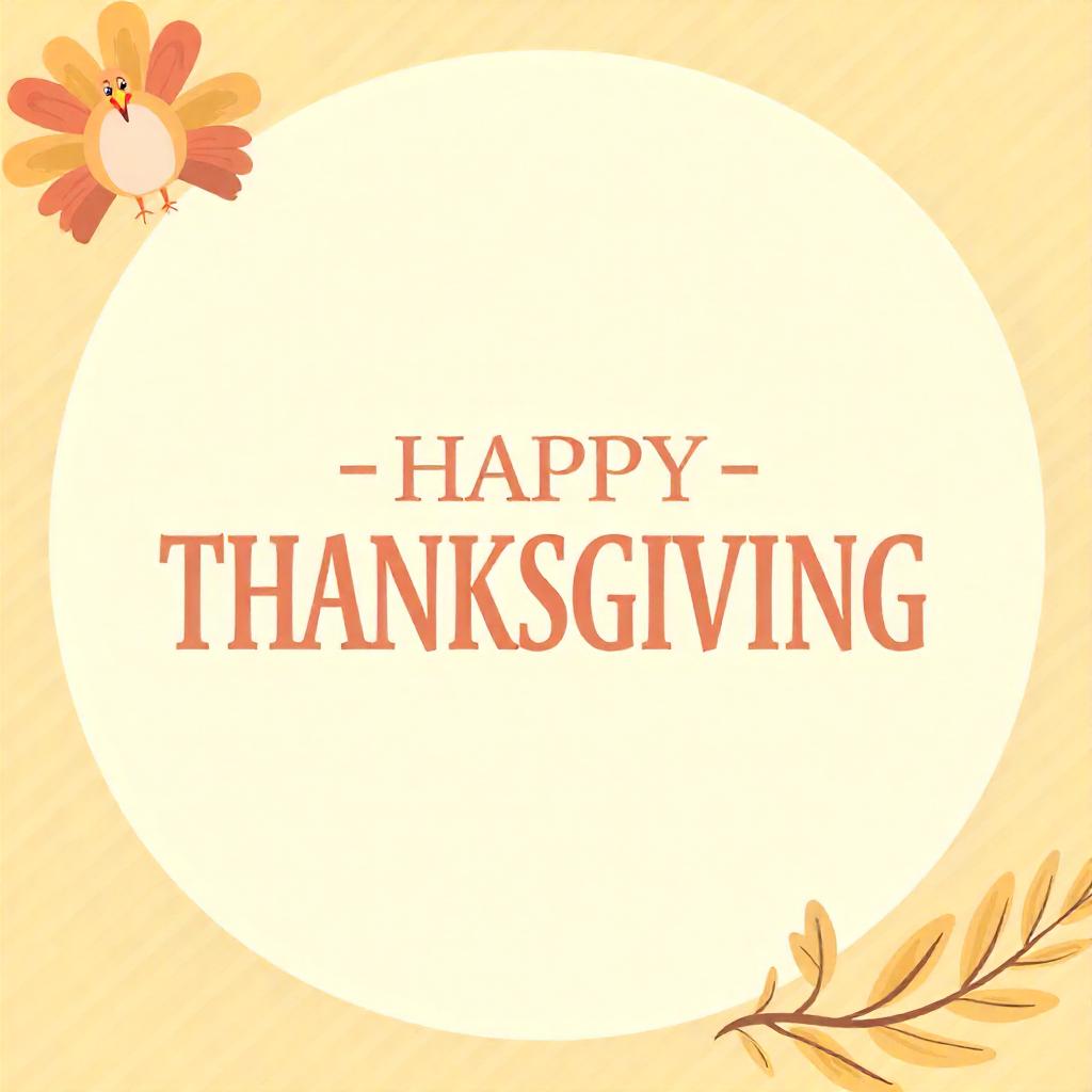 A happy Thanksgiving greeting card features a cartoon turkey and a branch with leaves.
