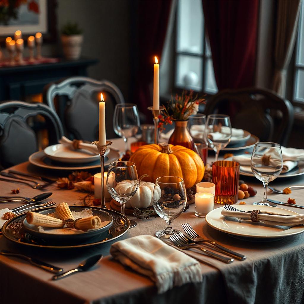 A fall table setting with candles and pumpkins