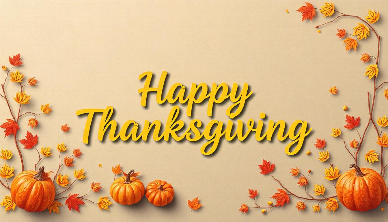 A festive Thanksgiving greeting with the words Happy Thanksgiving in yellow script surrounded by autumn leaves and pumpkins.